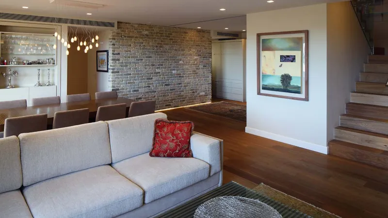 בסלון, אותו ניתן לראות מיד בכניסה לדירה, משולב קיר אומנותי מחופה לבני פירוק ממבנה עתיק באירופה. התאורה, כפי שניתן לראות בתמונה, זורקת אור כמו מתוך הקיר, אפקט שנותן אשליה של קיר מרחף!