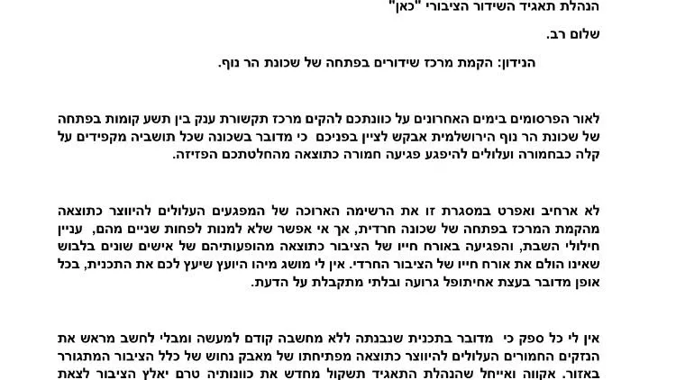 לאור הפרסומים על הכוונה למקם את 'תאגיד השידור הציבורי' בפתחה של שכונת הר נוף הירושלמית, סגר"ע ירושלים חיים אפשטין פנה במכתב להנהלת התאגיד • "מי היועץ שלכם?"