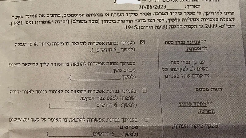 חודש אחרי שחרורו בבית המשפט, מסרו הבוקר בלשי ימ"ר ש"י לפעיל ההתיישבות אלישע ירד, צו המודיע לו בכוונת אלוף פיקוד מרכז להוציא כנגדו צו הגבלה מנהלי למשך חצי שנה בכפוף לשימוע