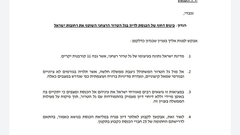 מרכז האופוזיציה דורש: לכנס את המליאה לדיון חירום בנושא גל הטרור