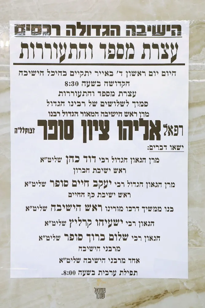 במלאת השלושים לפטירתו של ראש הישיבה הגאון רבי אליהו ציון סופר זצוק"ל זצוק"ל התקיימה בהיכל הישיבה הגדולה 'קול אליהו' רכסים, עצרת חיזוק והספד במעמד גדולי ישראל ראש הישיבה ורבני הישיבה שליט"א ובהשתתפות מאות תלמידים ושומעי לקחו מהעיר ומרחבי הארץ