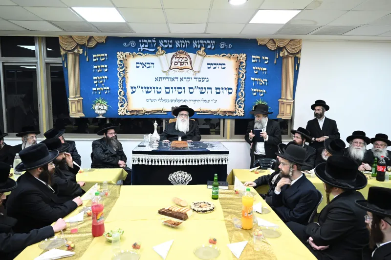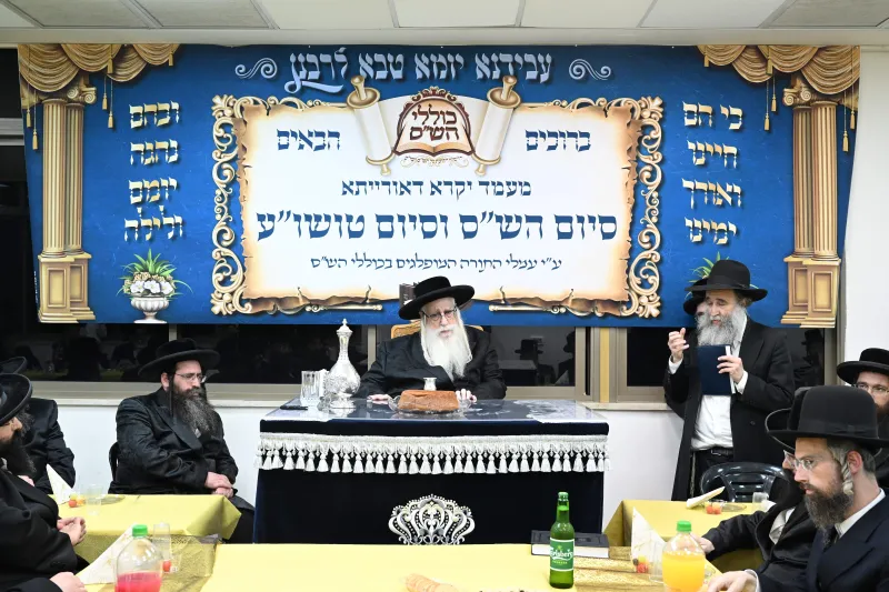 מעמד יקרא דאורייתא נערך בבית האדמו"ר מצאנז לכבוד קבוצת אברכים שלמדו ונבחנו על כל הש"ס וכן לקבוצה שלמדו ונבחנו על כל ד' חלקי טור שולחן ערוך. נאם במעמד: הגאון הגדול רבי איתמר גרבוז ראש ישיבת אורחות תורה | צילום: משה גולדשטיין