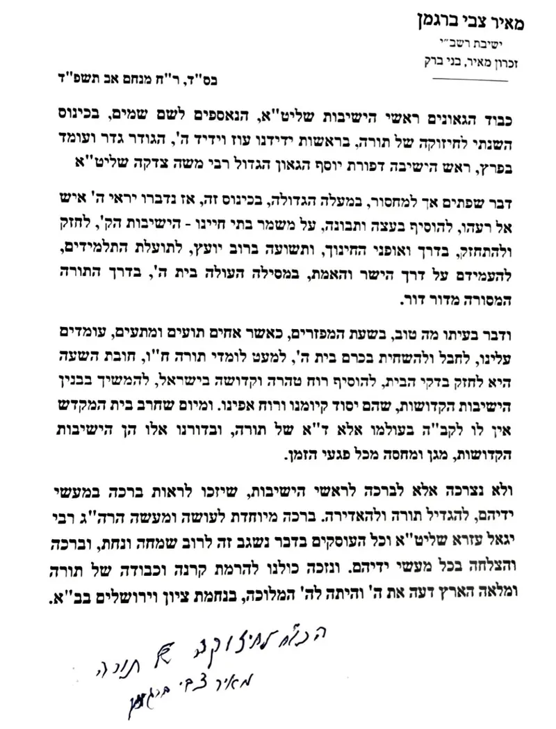 במהלך הכינוס הוקרא מכתבו של ראש הישיבה הגרמ"צ ברגמן שנכתב במיוחד לכבוד הועידה.