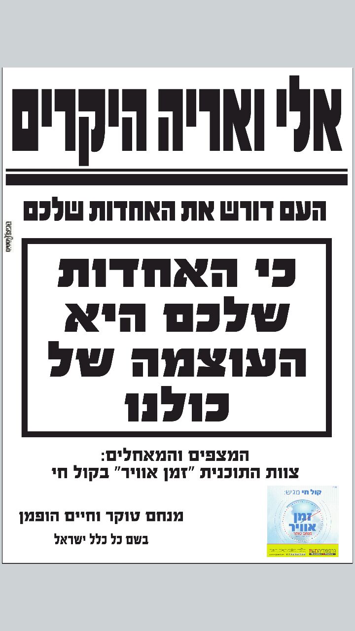 התוכנית "זמן אוויר" ברדיו קול חי ממשיכה לפנות ולעמול למען אחדות השורות במגזר החרדי.