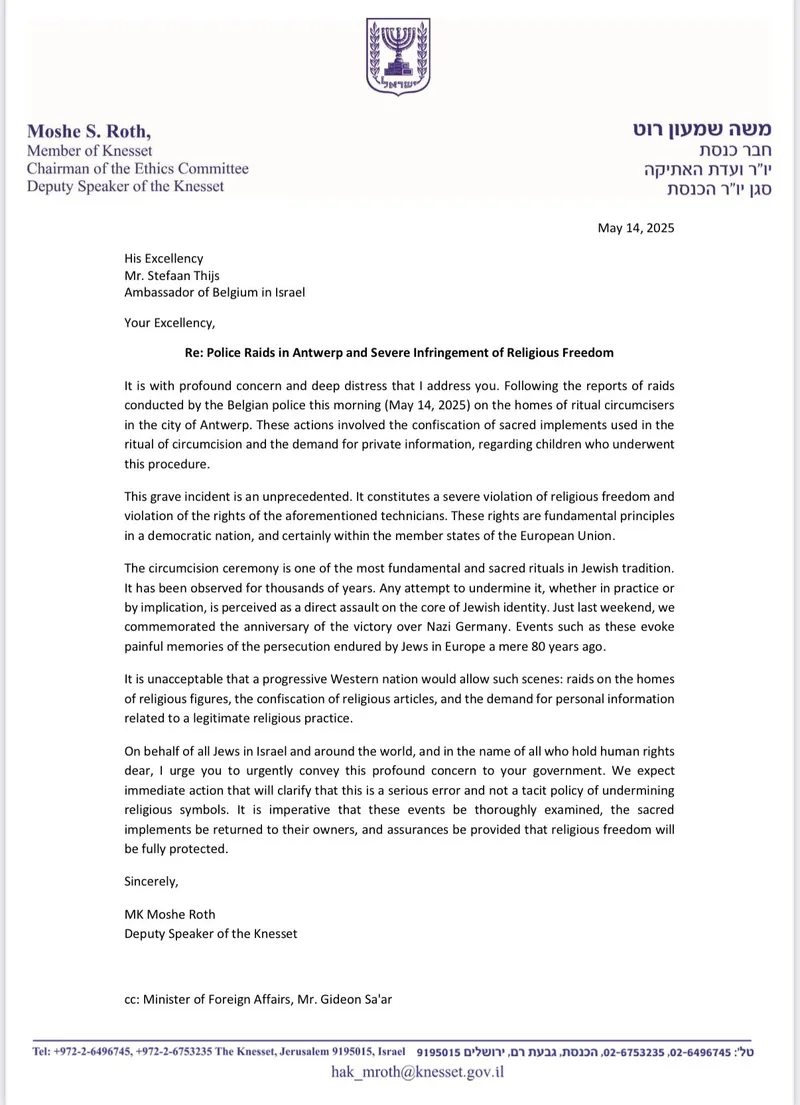 סגן יו"ר הכנסת דרש מהשלטונות הבלגיים לבדוק את האירוע באופן מיידי, להשיב את כלי המילה למוהלים ולוודא שחופש הדת של הקהילה היהודית יישמר במלואו וללא פשרות.