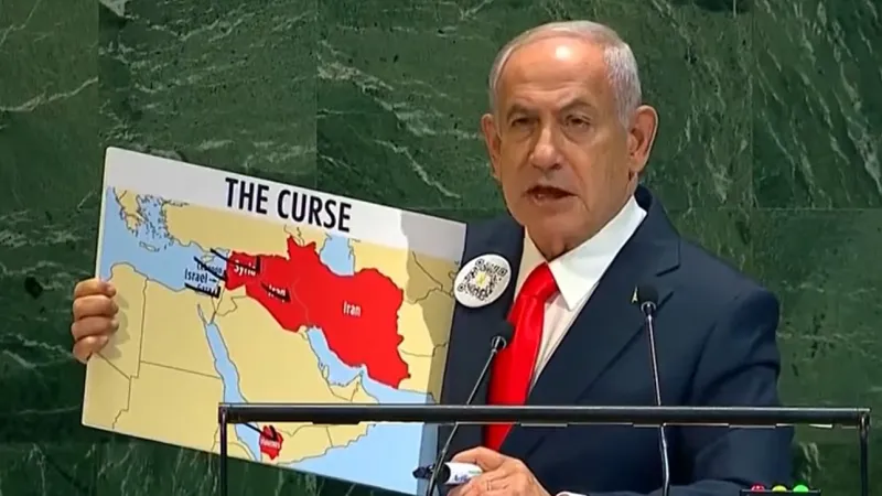 בפתח דבריו חזר נתניהו אל המפה שהציג בעצרת בשנה שעברה ואמר: ״הצלחנו לשבור את ציר הרשע, מנענו אסון בקנה מידה עולמי והצילו חיי אלפים״. הוא הוסיף: ״אז הראיתי כאן את האיום שהגיע מאיראן, היום ניתן לומר – חיסלנו את רוב יכולות חמאס, פגענו בחות׳ים, השמדנו את מערך הגרעין והטילים של איראן, שלחנו מסרים ברורים לחיזבאללה, הרגנו את נסראללה והרסנו את צבאו של אסד״.