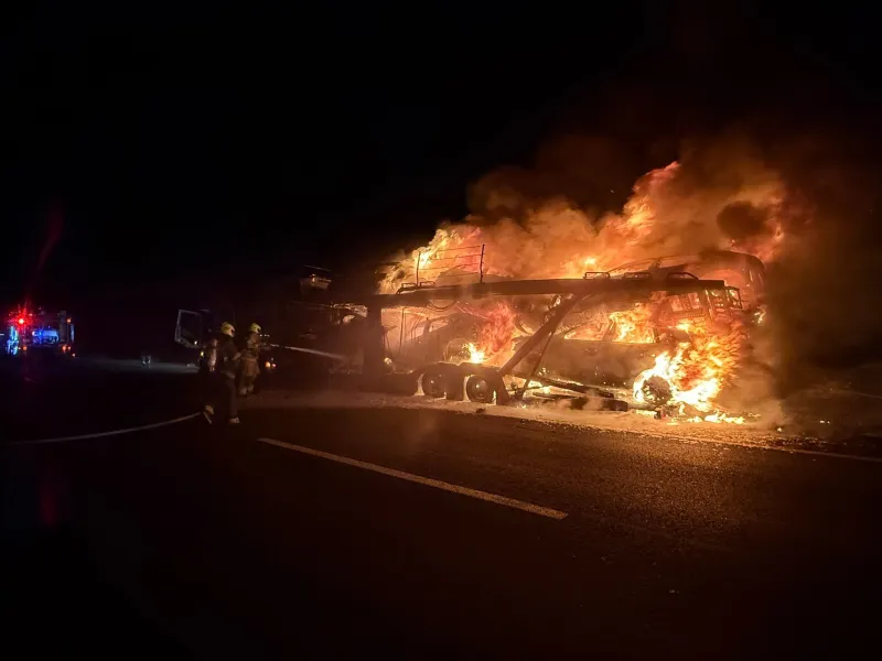 ארבעה צוותי כיבוי מתחנת עפולה פועלים בשעה זו בשריפת משאית להובלת רכבים בכביש 6, סמוך למחלף רמות מנשה. משטרת ישראל חסמה את כביש 6 לצפון, סמוך למחלף עין תות.