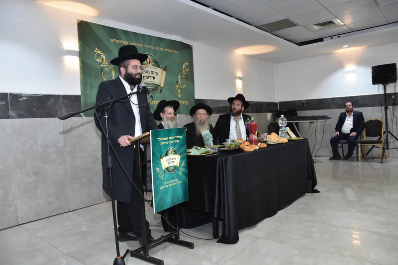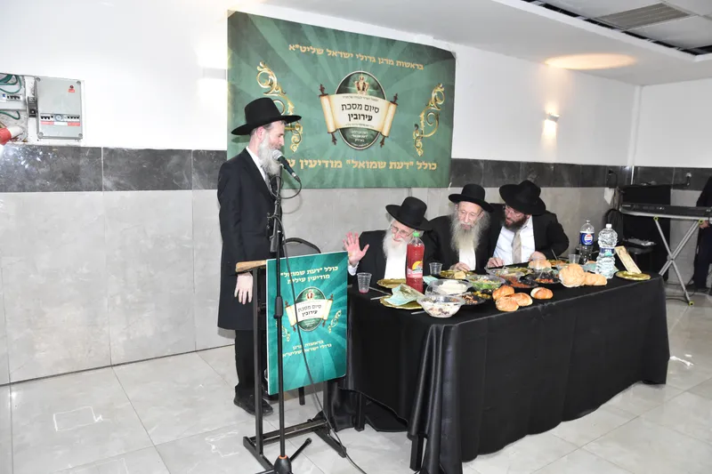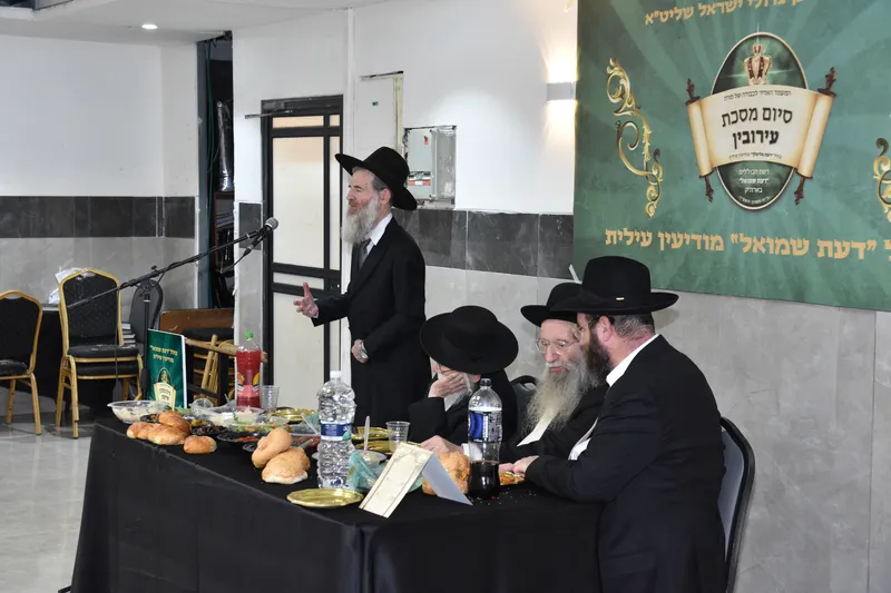 מעמד כבודה של תורה בסיום מסכת עירובין ע"י כולל 'דעת אלימלך' במודיעין עילית שע"י רשת הכוללים 'דעת שמואל' בהשתתפות מאות האברכים וראש הכולל הרב יעקב סלבוטיצקי יחד עם ראש רשת הכוללים הרב מרדכי דינר.