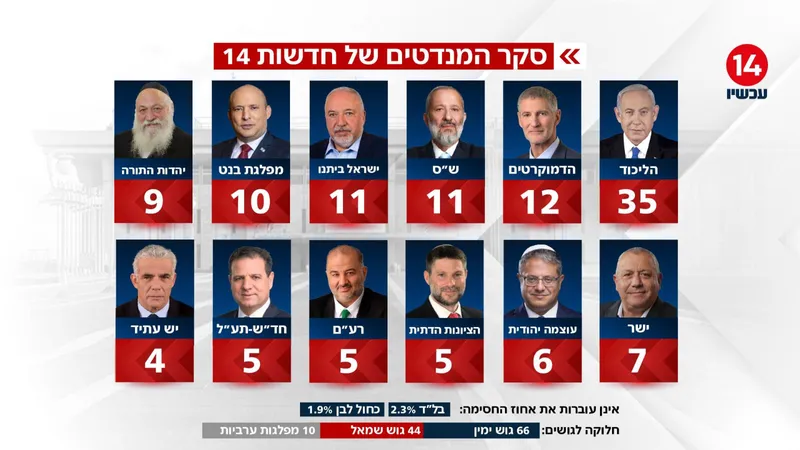 גוש ימין: 66 מנדטים, גוש שמאל: 44 מנדטים, מפלגות ערביות: 10 מנדטים.