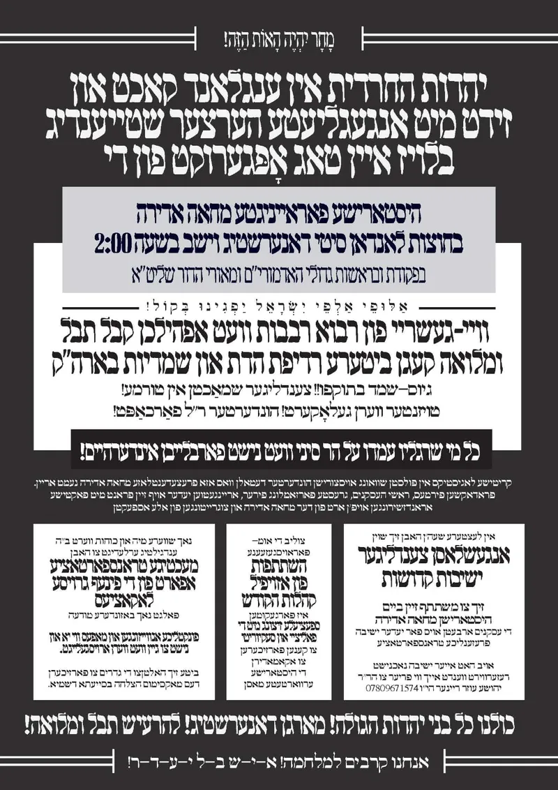 כעת, רבני בד"ץ 'כדתיא' בלונדון יובילו את המחאה ההמונית ואף כתבו מכתב לאור הבקשה של בד"ץ 'העדה החרדית' בירושלים. בהפגנה צפויים להשתתף שני הפלגים בחסידות סאטמר שהתאחדו לרגל ההפגנה הגדולה, והאירוע באופן סמלי ייערך בכ"א כסלו 'יום ההצלה' של האדמו"ר ר' יואליש מסאטמר זצ"ל.