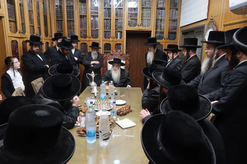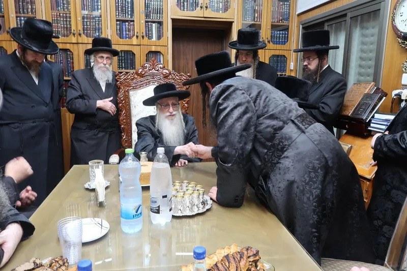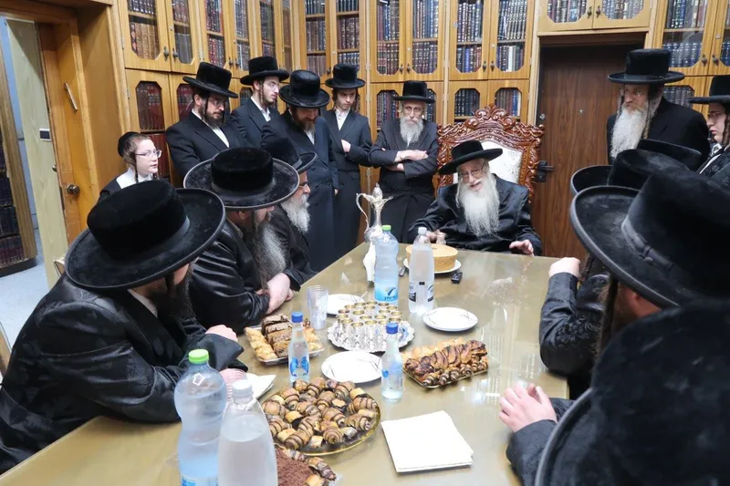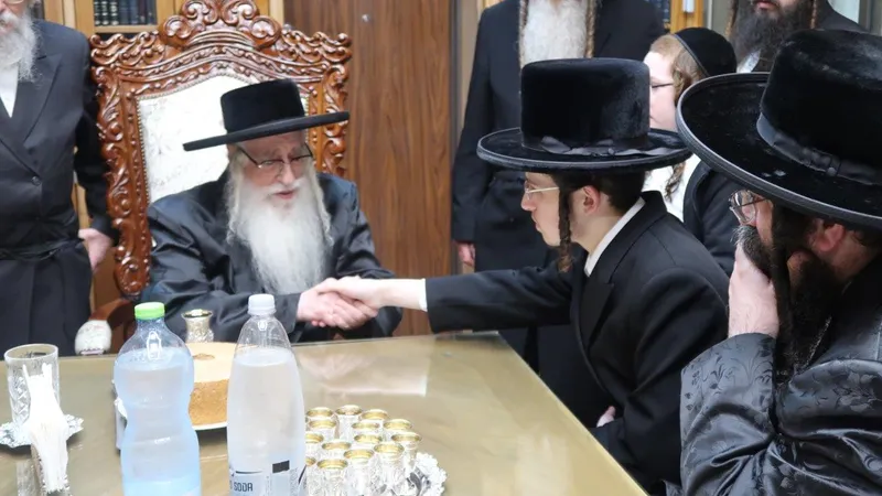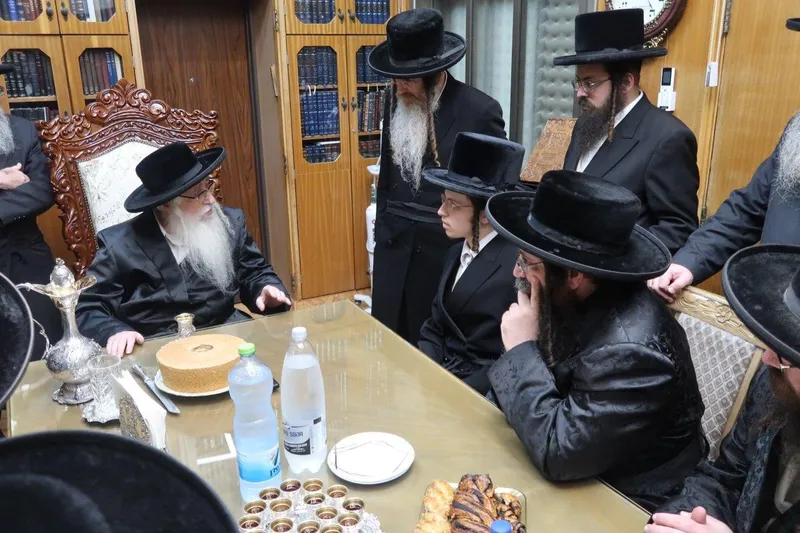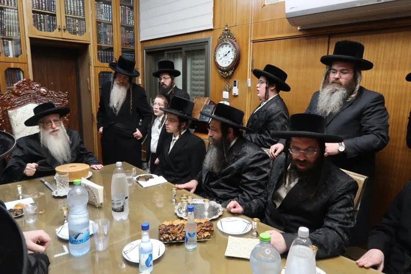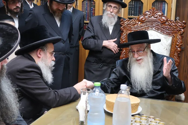 תיעוד משמחת אירוסי נכדת מרן אדמו"ר מצאנז בת לבנו הגה"צ רבי אברהם הלברשטאם אב"ד קרית צאנז טבריה והגלילות חתן האדמו"ר מסטרופקוב, עם החתן הרב אשר אנשיל למברגר בן הגה"צ רבי ישראל למברגר אב"ד מאקווא בית שמש בן גאב"ד מאקאווא חתן האדמו"ר מדזיקוב ויז'ניץ.