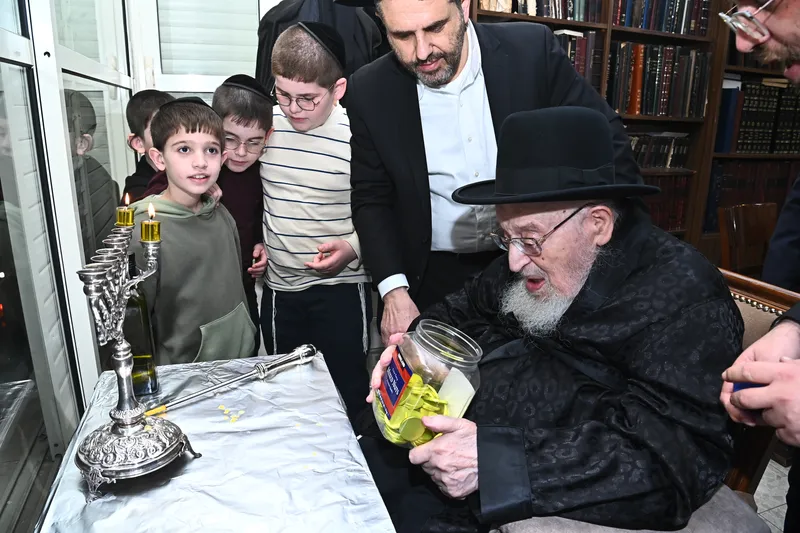 תיעוד מהדלקת נר ראשון של חנוכה אצל מרן הגרמ"צ ברגמן. אחרי ההדלקה חילק מרן מטבעות שוקולד לנוכחים
