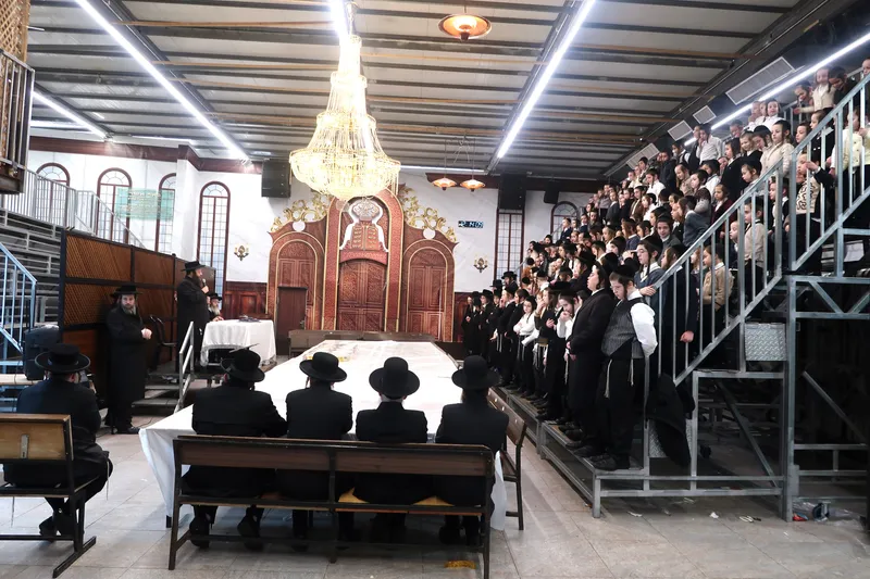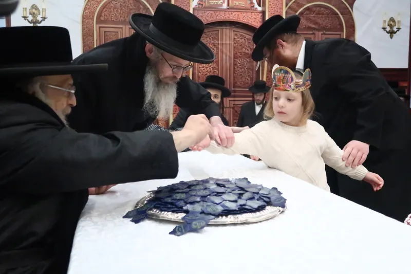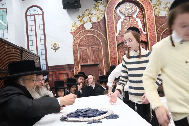 תיעוד ממעמד חלוקת חנוכה געלט בתלמוד תורה 'אהל אברהם אלימלך' דחסידי פינסק קרלין בירושלים בראשות האדמו"ר.