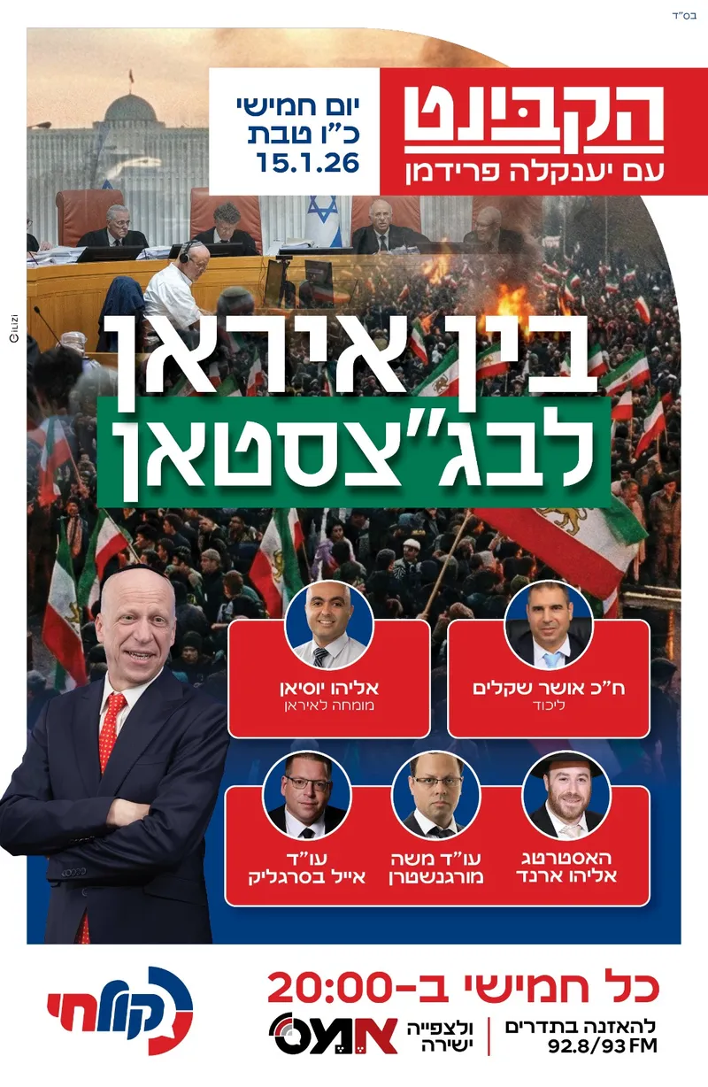 עם עיניים לאיראן, מתי טראמפ יתקוף ופתיחת המקלטים בישראל, לצד המשך שלטון בג"ץ והתערבותו בכל נושא ועניין הנוגע לחרדים, פאנל הפרשנים 'הקבינט' בהגשת יענקלה פרידמן מתכנס הערב (חמישי) לדון בכל הנושאים שהעסיקו אותנו השבוע.