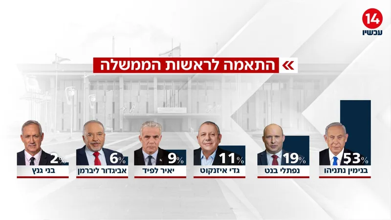 גם בשאלת ההתאמה לראשות הממשלה נרשמת תמונה ברורה. בנימין נתניהו מוביל בפער גדול עם 53% תמיכה, נתון כמעט זהה לזה שנרשם בסקר הקודם. אחריו ניצב נפתלי בנט עם 19%, ולאחר מכן גדי איזנקוט עם 11%. יאיר לפיד זוכה ל־9%, אביגדור ליברמן ל־6%, ובני גנץ סוגר את הרשימה עם 2% בלבד.