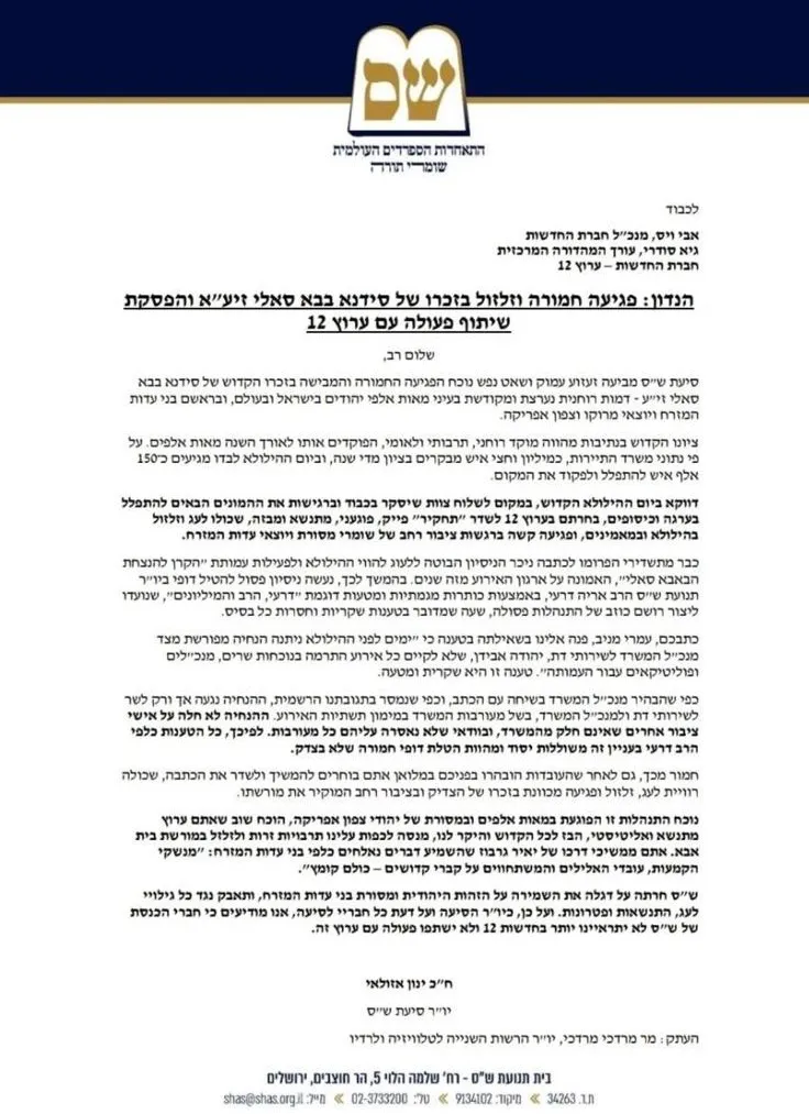 ח"כ ינון אזולאי, יו"ר סיעת ש"ס, שלח היום מכתב לקברניטי ערוץ 12 שבו הודיע להם על הפסקת שיתוף הפעולה והראיונות בערוץ, בעקבות 'תחקיר' שמתכוונים בערוץ לשדר בעיצומו של יום הילולת הבבא סאלי זיע"א, שכולו לעג וזלזול בהילולא ובמאמינים, כלשון אזולאי. בכך, מצטרפת מפלגת ש"ס לחרם על ערוץ 12 שהוכרז מצד שרים וחברי כנסת רבים מהקואליציה, בין היתר בעקבות עלילת 'שדה תימן' אותה הפיץ הערוץ, וגרמה לפגיעה חסרת תקדים בישראל וביהודי העולם.