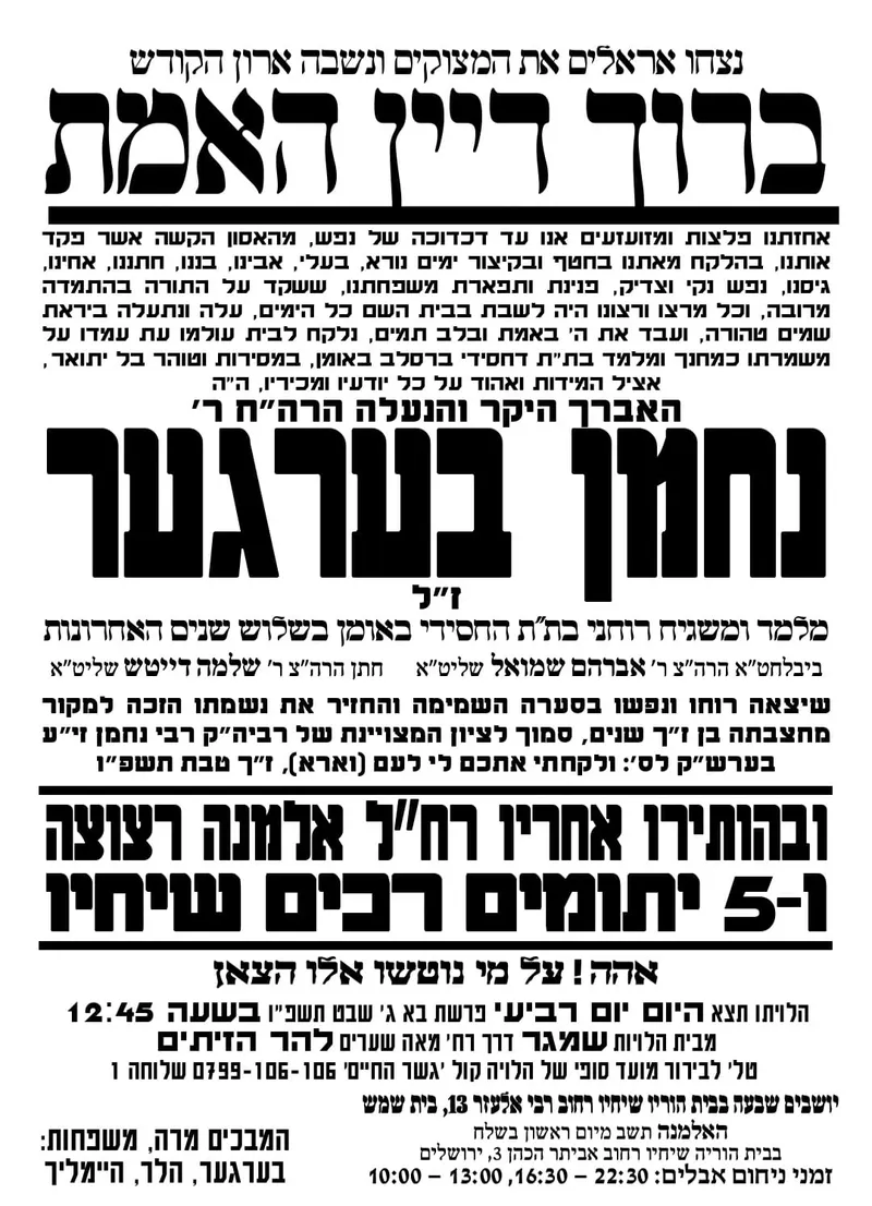 מקודם >>> לחצו כאן לתרומה עבור האלמנה והיתומים של הרב נחמן ברגר ז"ל
