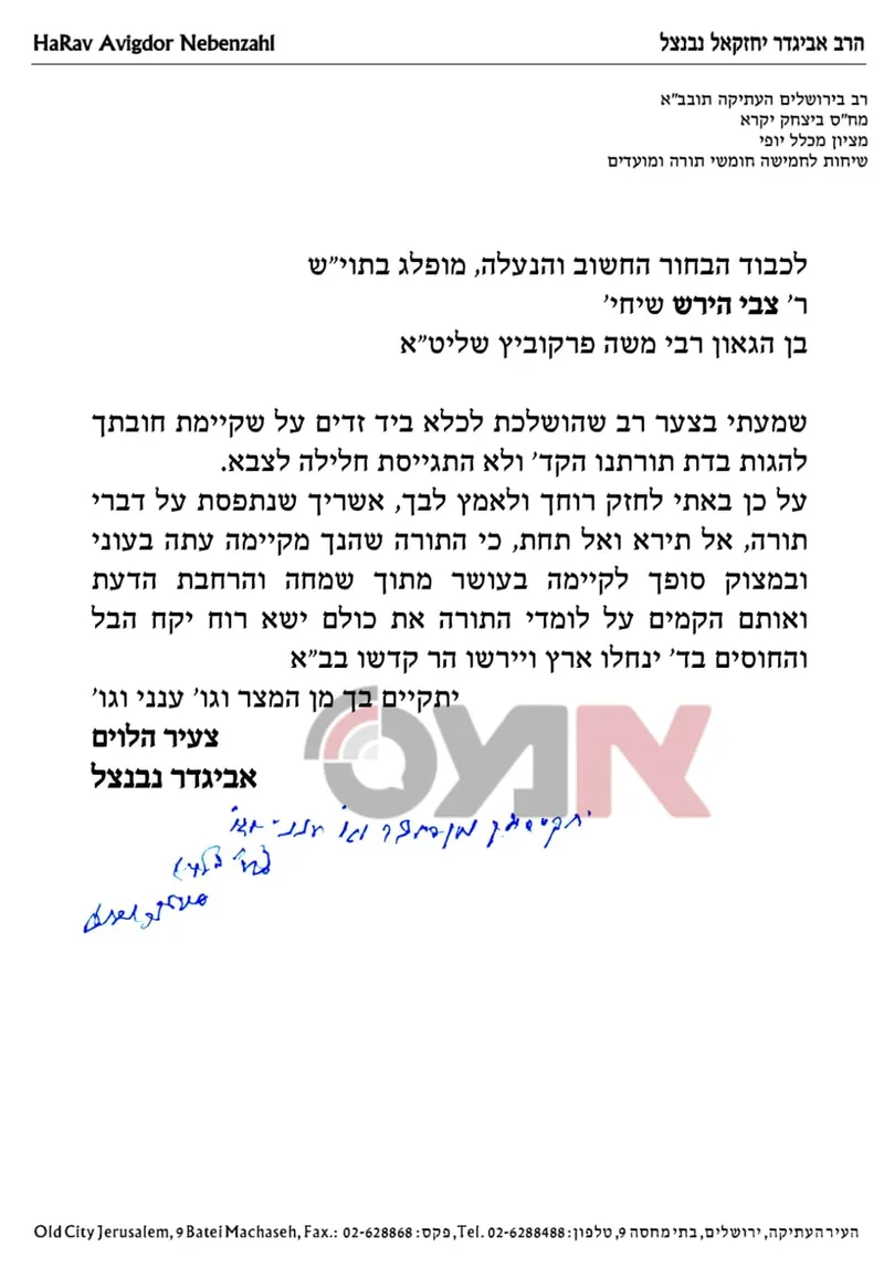 הגאון רבי אביגדור נבנצאל, יצא בימים האחרונים בצעד נדיר הממחיש את כאבו העמוק על רדיפת עולם התורה, כאשר שיגר מכתב חיזוק אישי אל הבחור צבי פרקוביץ, מבחירי ישיבת פוניבז' השוהה בכלא הצבאי.
