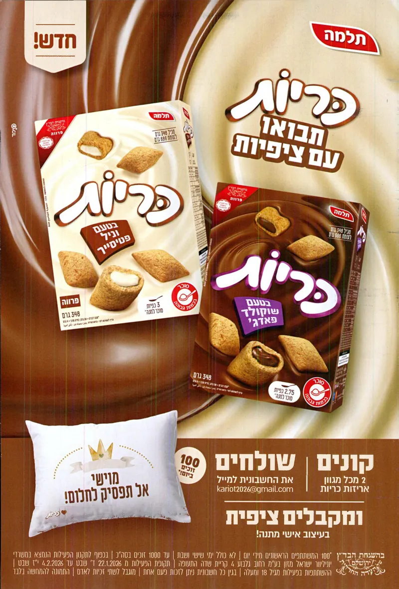 חברת 'תלמה' בקמפיין לדגני הבוקר 'כריות' מבית משרד הפרסום 'מימד'. מי שמסתכל על המודעה בדיגיטל החרדי או בעיתונות רואה שתי אריזות של הטעמים וניל פטיסייר ושוקולד פאדג'. אבל אז העין קולטת את הקריאייטיב: המשפט "כריות – תבואו עם ציפיות". זה משחק מילים חכם בין הציפייה לטעם המתוק לבין הציפית של הכרית ואז העין רואה כרית שינה אמיתית, לבנה ורכה, שכתוב עליה "מוישי, אל תפסיק לחלום!". הקמפיין מייצר חיבור חכם בין המוצר למבצע: קונים שתי אריזות ומקבלים ציפית בעיצוב אישי. חיבור רגשי בין הרכות של השינה והחלומות של הילדים, לבין הפינוק של דגני הבוקר.