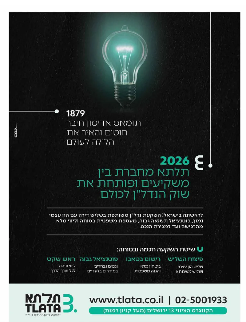 מעולם הצריכה עוברים להשקעות. קבוצת *תלתא* שיצאה השבוע בקמפיין שמתחיל בויז'ואל היסטורי ומרשים: עמוד שחור ובמרכזו נורת הליבון של אדיסון דולקת, עם השוואה בין המצאת החשמל ב-1879 למהפכה של תלתא ב-2026. מעבר למטאפורה על אדיסון שחיבר חוטים, יש גם מוצר תכל'ס – "שיטת השליש": אפשרות להשקעה בשותפות בדירה עם הון עצמי נמוך. המסר המרכזי כאן הוא ביטחון: הם מדגישים באותיות גדולות "רישום בטאבו" ו"בטוחה מלאה". כלומר, מעבר לדרמה של המנורה והחדשנות, הם מוכרים כאן פתרון פרקטי למצוקת הדיור וההשקעה, שמאפשר כניסה לשוק הנדל"ן עם רשת ביטחון משפטית חזקה.