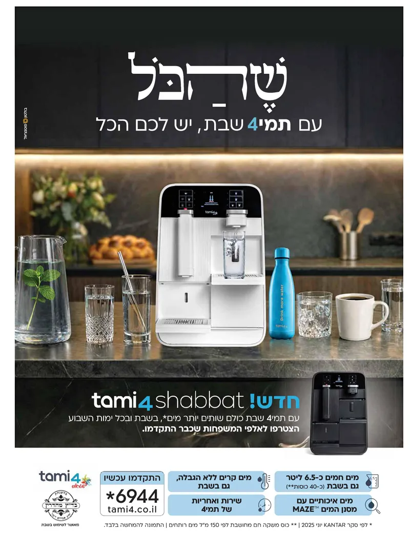 נתחיל מהמטבח. אי אפשר היה לפספס השבוע את קמפיין 'תמי4 שבת' . של משרד הפרסום 'בולטון-פוטנציאל'. הם עשו עבודה ויזואלית חכמה כשבנוסף לתמונה של המכשיר המעוצב במטבח יוקרתי, מופיעה מעליו מילה אחת ענקית: "שֶׁהַכֹּל". המסר הוא כפול עם חיבור לברכה עצמה כשבתשדיר שומעים גם את הברכה "שהכל נהיה בדברו", ומצד שני הכיתוב והקריינות המשלימים: "עם תמי 4 שבת, יש לכם הכל". הם לקחו מכשיר טכנולוגי חשמלי, שעלול להיתפס כבעייתי בשבת, והפכו אותו ל"גלאט". הם אומרים לנו: אתם לא מתפשרים על ההלכה, אתם משדרגים את לכם עונג השבת.