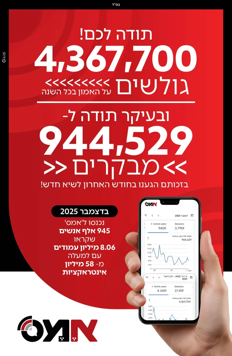 נזכיר כי גם אתר אמס רשם זינוק גדול ומשמעותי במהלך השנה שחלפה, כאשר בחודש דצמבר לבדו נכנסו לאתר כמיליון גולשים. גם בחודש הנוכחי נשברו שיאי כניסה ופופולריות של האתר. הנתונים המלאים יראו אור בימים הקרובים בס"ד. בשם ה' נעשה ונצליח, לקדש שם שמים.