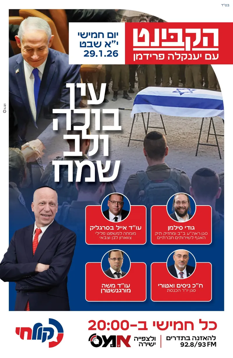 הערב, כמדי יום חמישי, מתכנס 'הקבינט' בהגשת יענקלה פרידמן ב'קול חי' בסימן "עין בוכה ולב שמח", לסיכום שבועי מרתק של הנושאים הבוערים ביותר על סדר היום.