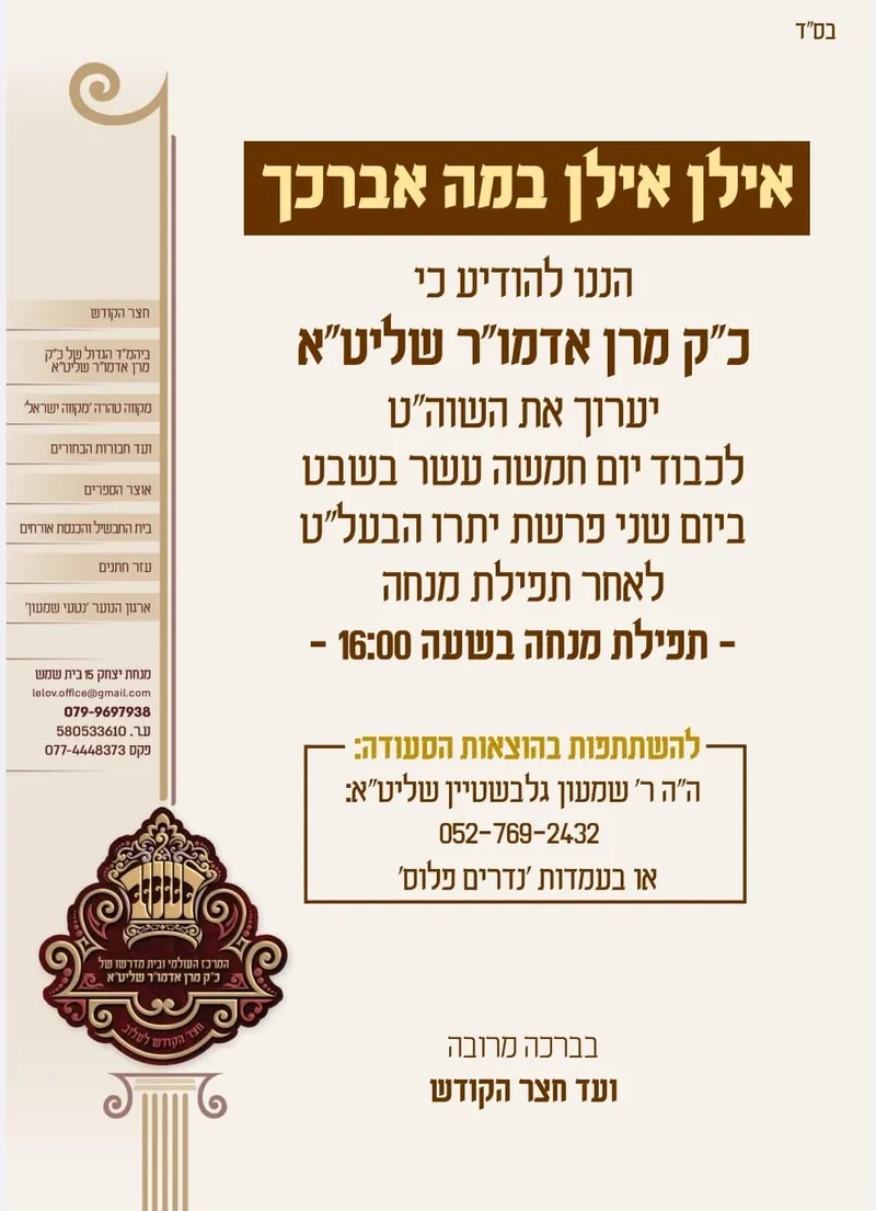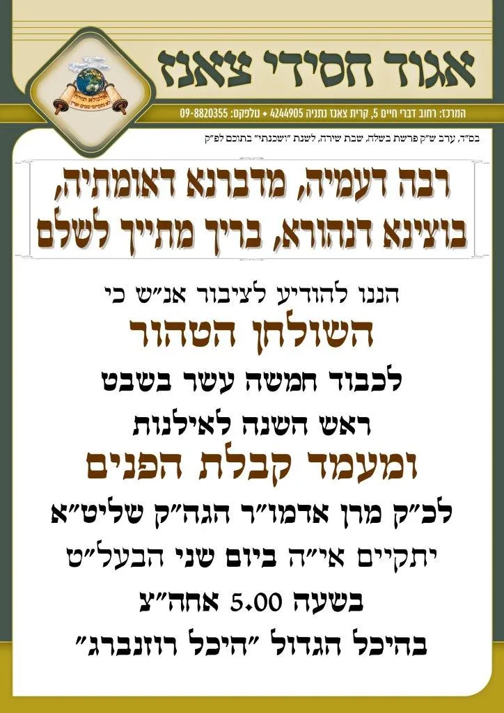 האדמו"ר מסערט ויז'ניץ יערוך את טיש ט"ו בשבט הערב בשעה 20:00 בערב בבית מדרשו ברמת ויז'ניץ בחיפה.