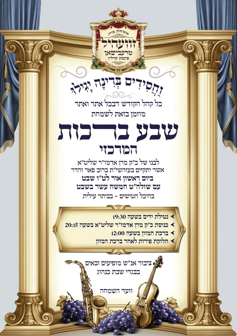 מרן האדמו"ר מויז'ניץ יערוך את טיש ט"ו בשבט בבית מדרשו הגדול בבני ברק מחר בשעה 16:45 בשילוב שמחת השבע ברכות לנינתו, יחד עם הסבים של הכלה האדמו"רים מויז'ניץ קייאמישא לייק וחתנו האדמו"ר מויז'ניץ בית שמש.