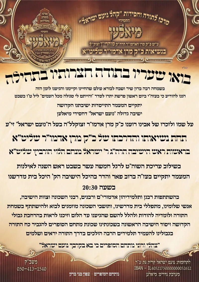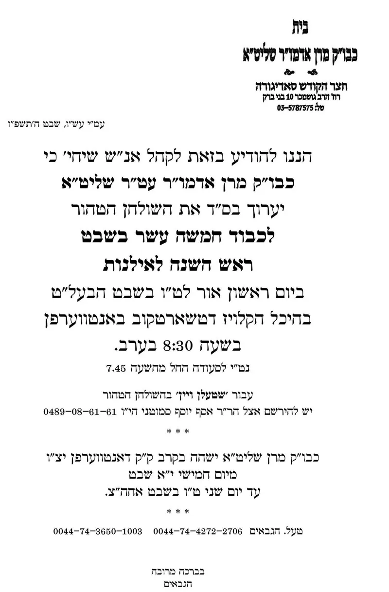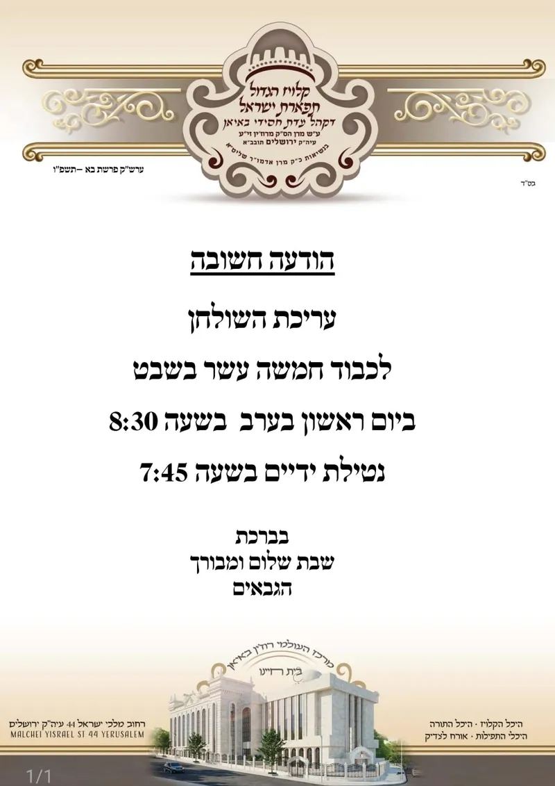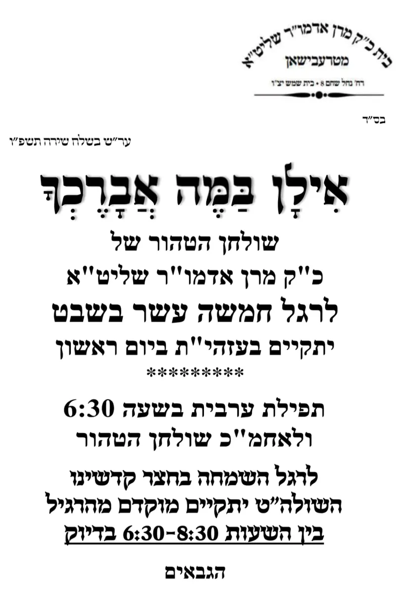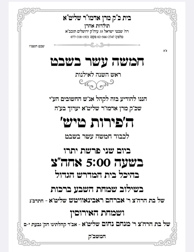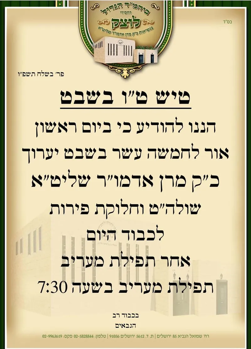 מרן האדמו"ר מבויאן יערוך את טיש ט"ו בשבט בבית מדרשו בירושלים בשעה 20:30 בערב.
