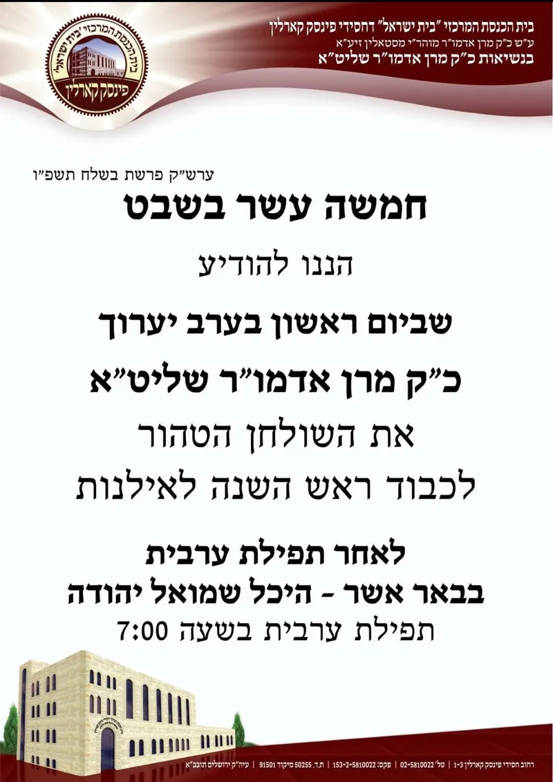 האדמו"ר מפינסק קרלין יערוך את טיש ט"ו בשבט בבית מדרשו בירושלים היום בערב בשעה 19:00.
