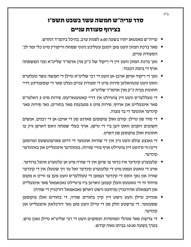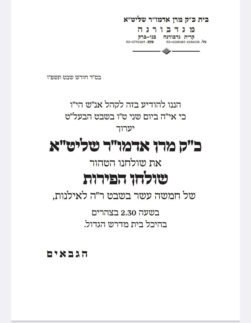 בחצר הקודש גור לא נהוג שמרן האדמו"ר עורך טיש ט"ו בשבט בכל שנה. אך השנה באופן חריג, עקב שמחת השבע ברכות האחרונה לנכדת האדמו"ר שתתקיים מחר בצהרים, בת לחתנו הגאון רבי חיים יהושע שארר, האדמו"ר יערוך את שמחת השבע ברכות בבית המדרש הגדול בירושלים בשילוב טיש פירות לרגל ט"ו בשבט.
