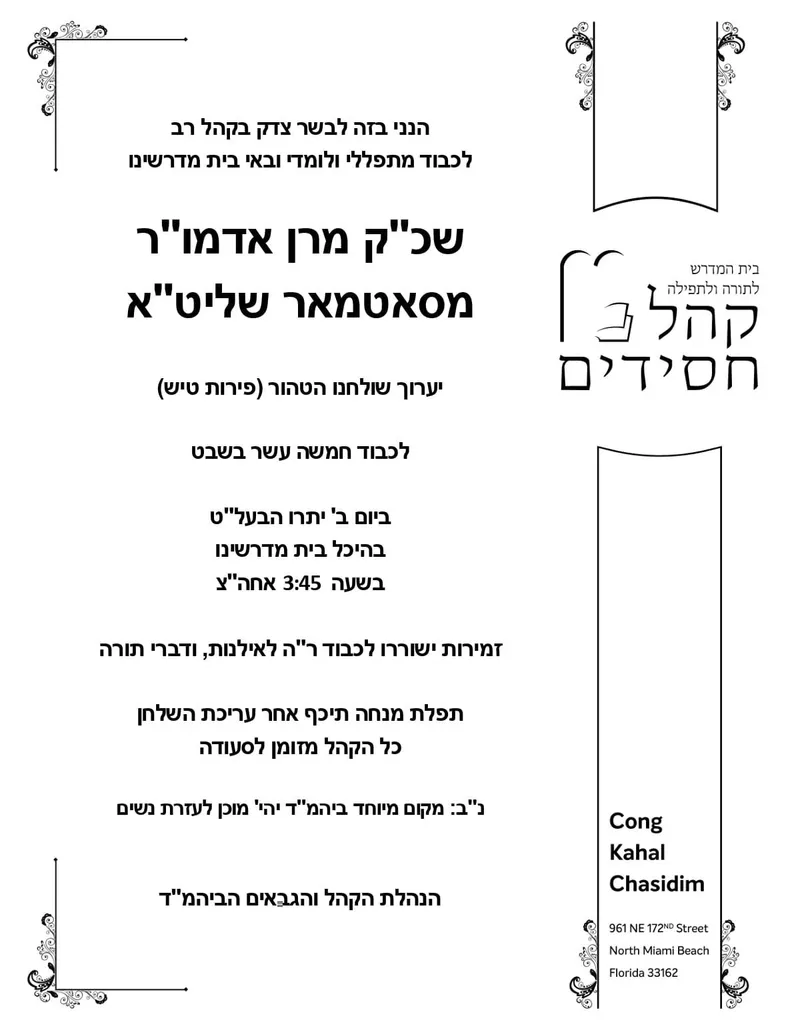 האדמו"ר המהרי"י מסאטמר ששוהה למנוחה במיאמי יערוך את טיש ט"ו בשבט בבית מדרשו במקום לקהל החסידים המתגוררים שם מחר בשעה 15:45.