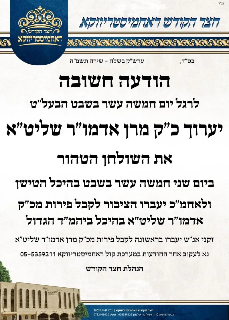 האדמו"ר מסקווירא יערוך את טיש ט"ו בשבט מחר בשעה 18:00 בערב בבית מדרשו בניו סקווירא, בשילוב הסעודת עניים לרגל שמחת נישואי נינתו שתתקיים ביום רביעי.