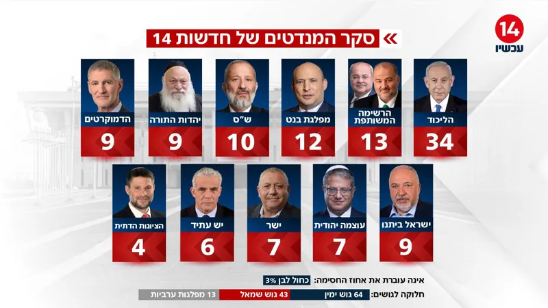 סקר חדשות 14 שפורסם הערב בערוץ 14 מצביע על ירידה קלה בכוחו של גוש הימין, לצד יציבות יחסית במערכת הפוליטית והמשך יתרון מובהק לראש הממשלה בנימין נתניהו בשאלת ההתאמה לראשות הממשלה.