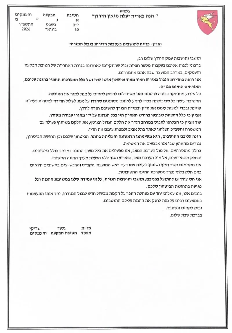 בצעד פיקודי יוצא דופן וכנות נדירה, שיגר היום (שישי) מח"ט הבקעה והעמקים, אל"מ גלעד שריקי, מכתב חריג לתושבי עמק הירדן, בו לקח אחריות מלאה על שרשרת מחדלי אבטחה בגבול המזרחי. על רקע ריבוי מקרי חציית הגבול בשבועות האחרונים, בחר המפקד הבכיר שלא להסתתר מאחורי ניסוחים עמומים והודה ביושר: "אני רואה בחדירת הגבול כאירוע חמור מאוד וכישלון אישי שלי ושל כלל המערכות תחתיי בהגנה עליכם".