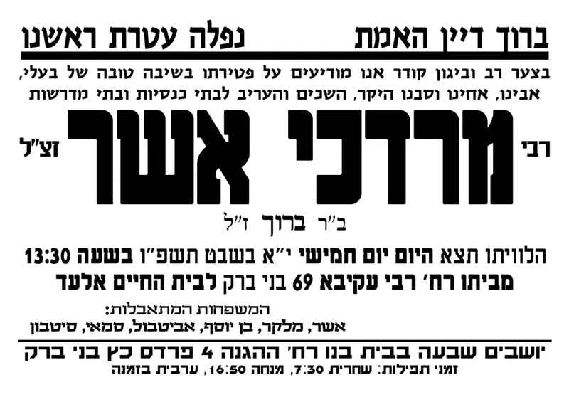 באותו יום, הסתלק לבית עולמו גם רבי מרדכי אשר זצ"ל. מסע הלוויה יצא לבית החיים באלעד – שם נטמן, והמשפחה האבלה יושבת שבעה בבית בנו ברחוב ההגנה 4 בעיר.