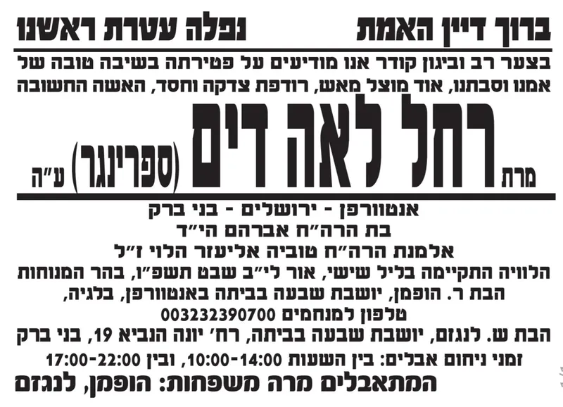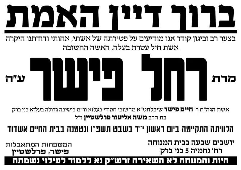 בנוסף הלכה היום לעולמה מרת רחל פישר ע"ה ונטמנה בבית החיים באשדוד. מכיוון שהמנוחה לא הותירה אחריה זר של קיימא (זש"ק), הציבור מתבקש לעשות חסד של אמת וללמוד לעילוי נשמתה הטהורה. האבלים יושבים שבעה בביתה ברחוב נחמיה 5 בבני ברק.