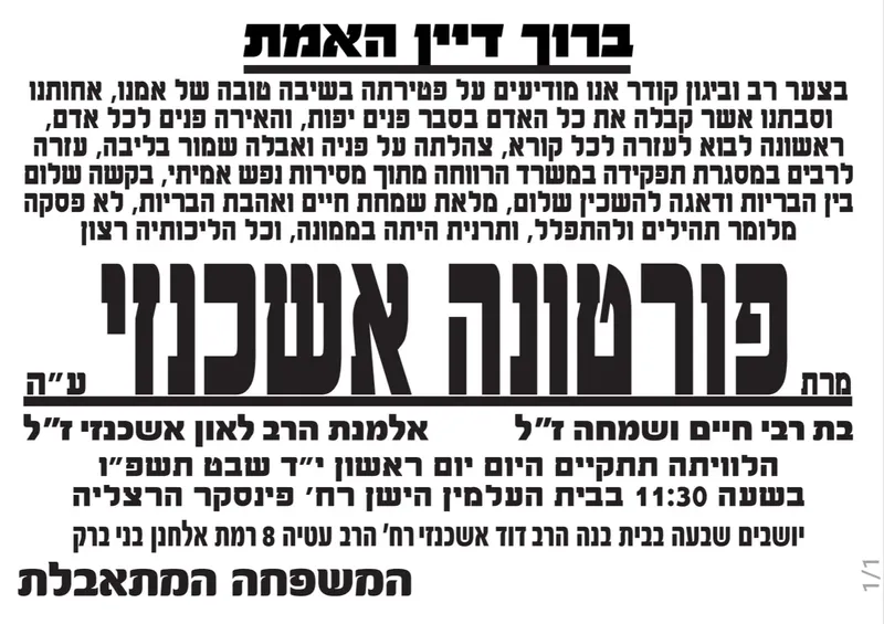 היום (ראשון) הלכה לעולמה מרת פורטונה אשכנזי ע"ה, דמות מוכרת שסייעה לרבים במסגרת עבודתה המסורה במשרד הרווחה. היא נטמנה בבית העלמין בהרצליה, ובני משפחתה יושבים שבעה בבית בנה ברחוב הרב עטיה 8 בעיר.