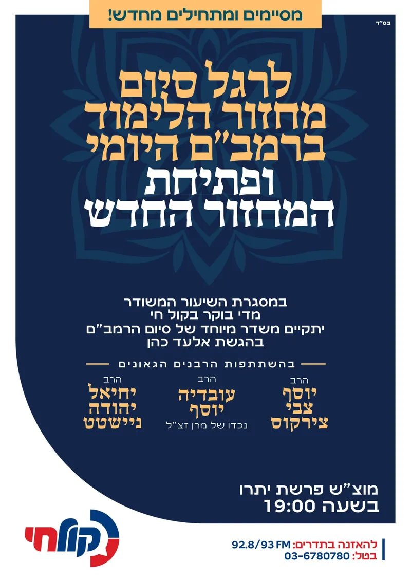 לרגל סיום מחזור הלימוד ברמב"ם היומי ופתיחת המחזור החדש, במסגרת השיעור המשודר מדי בוקר ב'קול חי' יתקיים משדר מיוחד של סיום הרמב"ם בהגשת אלעד כהן.