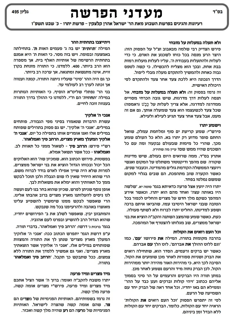 השבוע שיניתי את שניהם: כי שמעתי ווארט נפלא בשם הבאבובער רבי שלמה זצ"ל, ווארט חינוכי ממדריגה ראשונה, על הפסוק האחרון בפרשה: 'ולא תעלה במעלות על מזבחי' ולדעתי, חשוב שזה יישמע השבת בכל 'שבת טיש' בבתי ישראל, ולכן שיניתי את 2 הכללים, גם ווארט שלא חידשתי וגם מסוף הפרשה לראשית הגליון.
