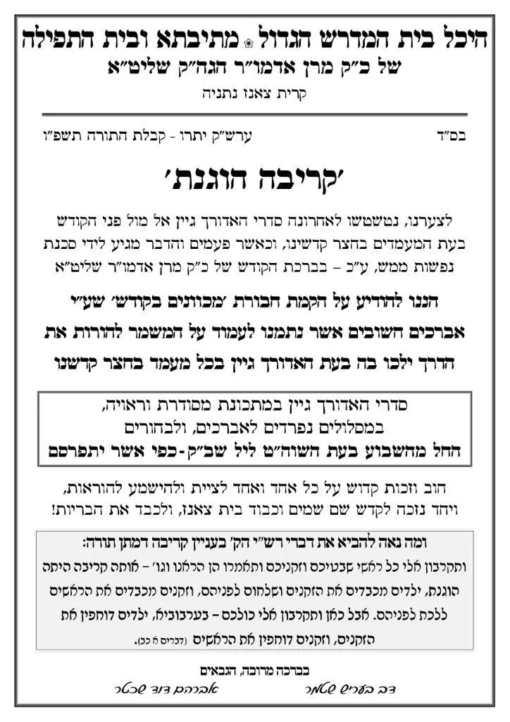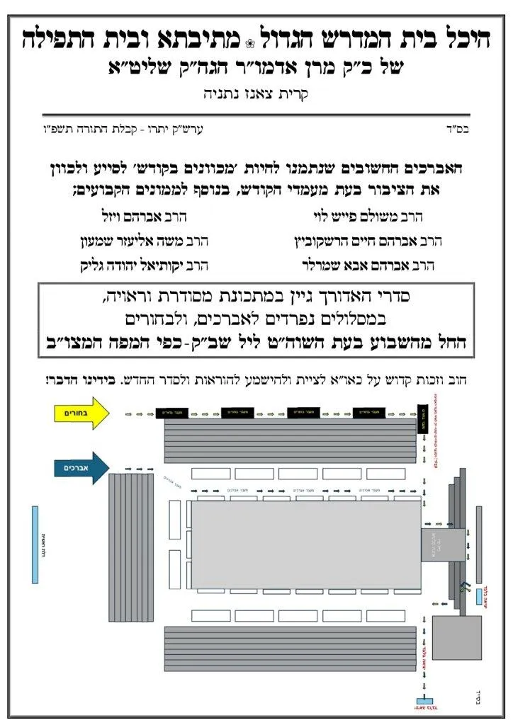 עוד נכתב במודעה: "סדרי האדורך גיין במתכונת מסודרת וראויה, במסלולים נפרדים לאברכים, ולבחורים החל מהשבוע בעת השוה"ט ליל שב"ק – כפי אשר יתפרסם. חוב וזכות קדוש על כל אחד ואחד לציית ולהישמע להוראות, ויחד נזכה לקדש שם שמים וכבוד בית צאנז, ולכבד את הבריות".