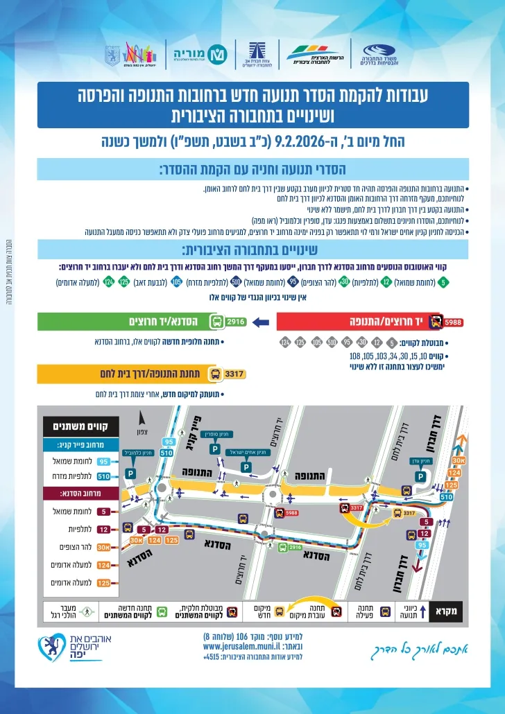 עיריית ירושלים, צוות תוכנית אב לתחבורה לירושלים וחברת מוריה מודיעים כי החל ממחר, יום שני כ"ב בשבט תשפ"ו, יחלו עבודות לשיפור תשתיות התחבורה באזור תלפיות. העבודות מבוצעות במסגרת מהלך להאצת לוחות הזמנים וצמצום משך הביצוע הכולל, וצפויות להימשך כשנה.