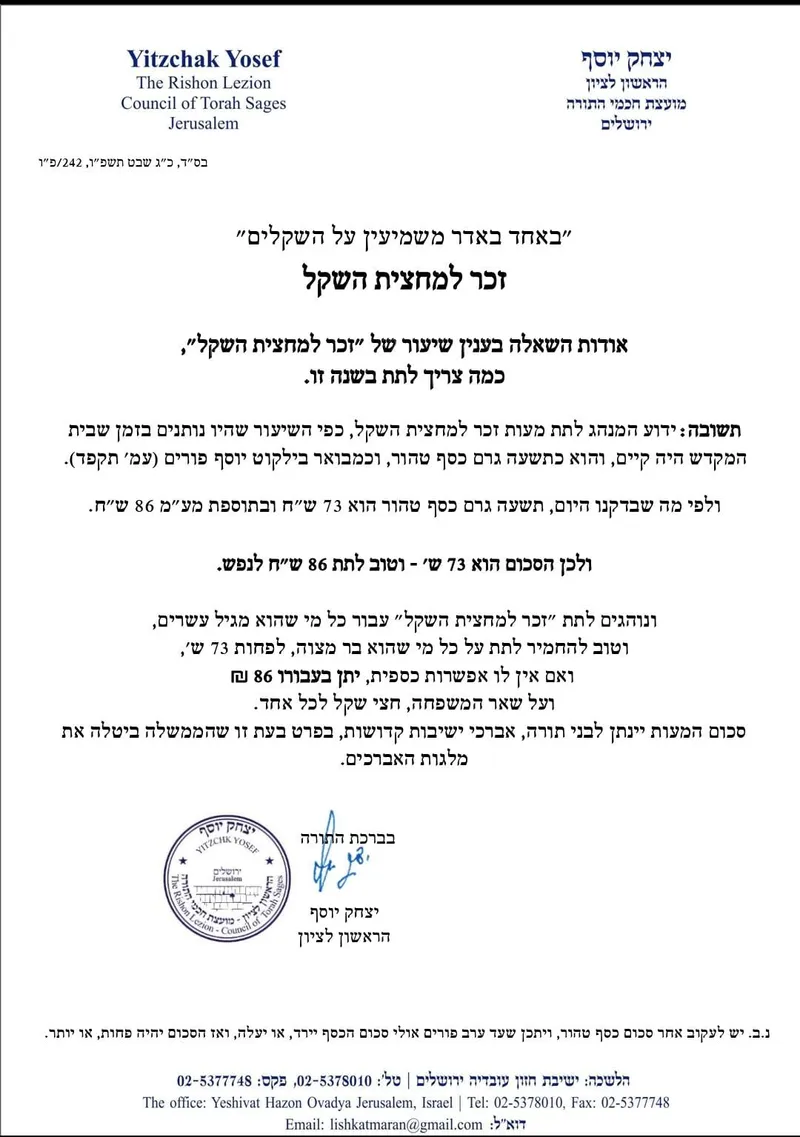 כמדי שנה, פרסם מרן הראשון לציון הגאון רבי יצחק יוסף, את שיעור זכר למחצית השקל לקראת ימי הפורים הבאים עלינו לטובה, בהתאם לשער הכסף הנסחר בעולם.