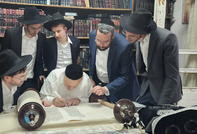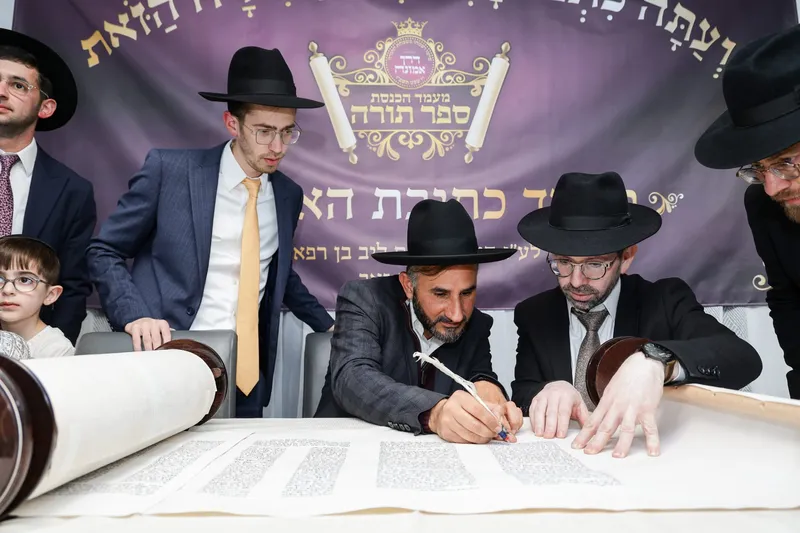 כתיבת ספר התורה החלה בדינר שנערך בתחילת השנה, ערב הימים הנוראים, במהלכו קיבלו על עצמם בני הקהילה השתתפות קבועה באמצעות תרומות בהוראת קבע. עד להשלמת כתיבת ספר התורה. כשבועיים טרם הכנסת ספר התורה, עלתה משלחת מהקהילה, למעונם של מרנן ורבנן גדולי ישראל, למעמד כתיבת אותיות.