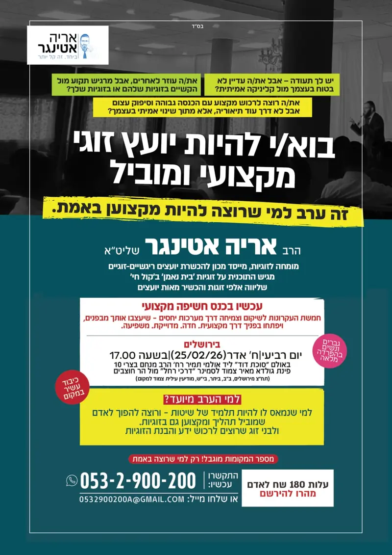 ומי שיעשה את התרגיל שהצעתי, ישב עם בן או בת הזוג, יבצע את התרגיל ויכתוב לנו שהוא עשה אותו – יקבל הטבה מיוחדת ויוכל להשתתף בכנס במחיר של 50 ש"ח בלבד.