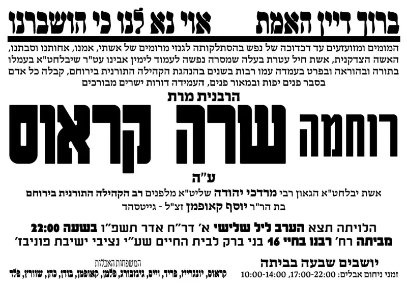 עוד אובדן כואב נרשם עם פטירתה בטרם עת של מרת שרה קראוס ע"ה, שהלכה לעולמה בגיל 77 לאחר שנזככה בייסורים בחודש האחרון. המנוחה, שהייתה סמל למעשי חסד וצניעות, נטמנה בבית החיים פוניבז'. הידיעה על פטירתה הכתה בהלם את מכריה הרבים שפוקדים כעת את בית המשפחה ברחוב רבנו בחיי בעיר.
