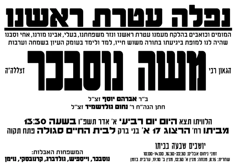 לצידו, הסתלק לבית עולמו גם הגאון הרב משה נוסבכר זצ"ל, שנטמן בבית החיים סגולה בפתח תקווה. הרב נוסבכר מתלמידי החכמים הידועים בסביבתו אשר דבוק היה כל חייו בתורה, לימד והפיץ תורה בעמל ועיון, ומשפחתו יושבת שבעה בבית המנוח ברחוב הרצוג, בין היושבים שבעה: בנו הגאון הרב נחום נוסבכר מרבני 'קול חי'.
