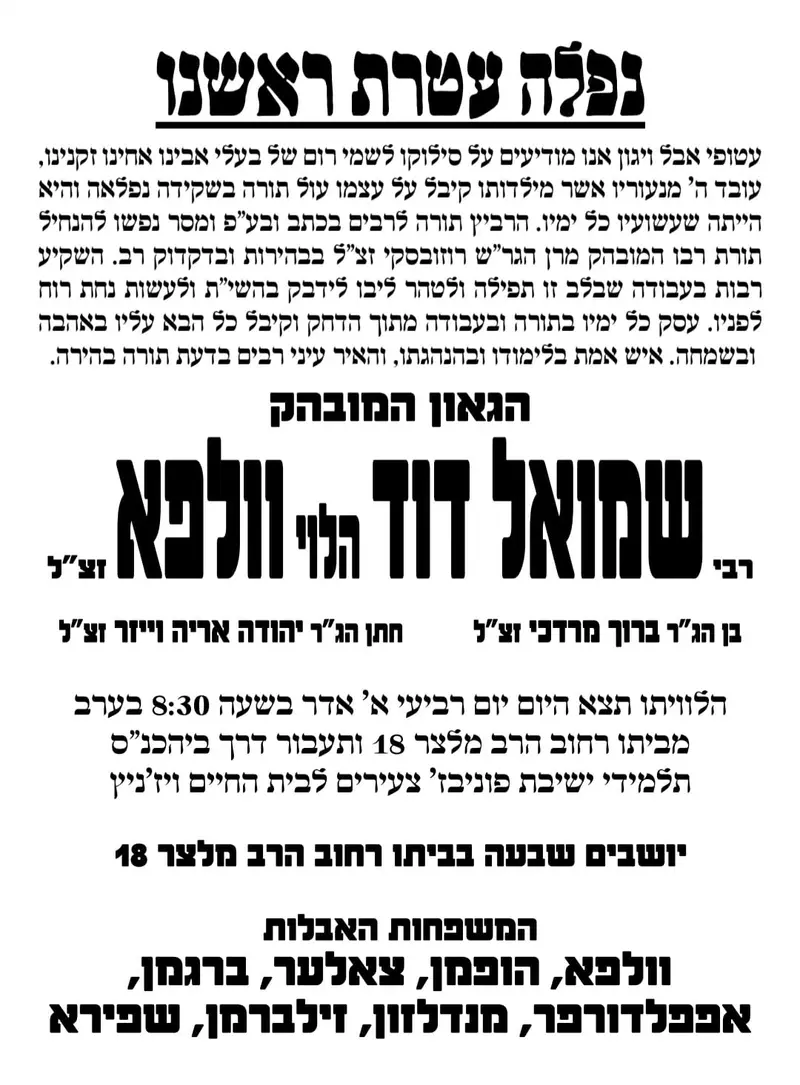במקביל, עולם התורה מבכה את פטירתו של הגאון רבי שמואל וולפא זצ"ל, שנפטר אמש (רביעי) בבני ברק ונטמן בבית החיים ויז'ניץ בעיר. דמותו המאירה תחסר מאוד למכריו ושכניו ברחוב מלצר, שם מתקיימת כעת השבעה.