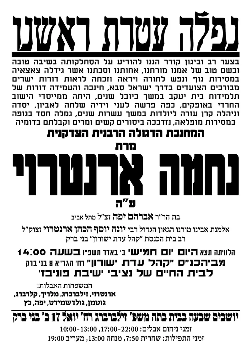 הבוקר (חמישי) הלכה לעולמה בבית החולים 'מעייני הישועה', הרבנית הצדקנית מרת נחמה ארנטרוי ע"ה, בשיבה טובה בגיל 90. המנוחה, אלמנתו של הגאון רבי יונה יוסף ארנטרוי זצ"ל, הייתה דמות חינוכית נערצת וממקימי עולה של תורה בעיר אופקים ובישיבת השרון. מסע הלווייתה יצא בצהריים מביה"כ 'קהל עדת ישורון' לעבר בית החיים פוניבז'.